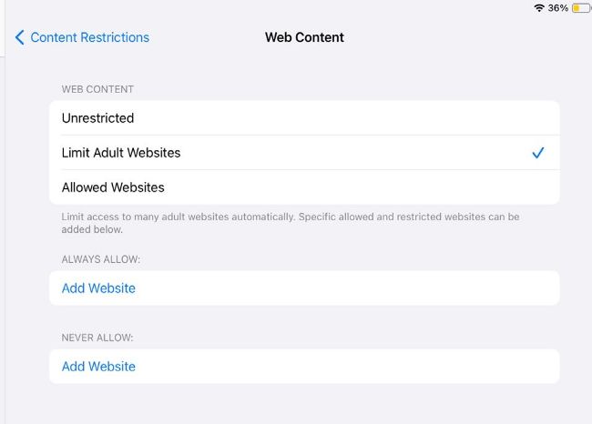 Within the Web Restrictions settings you will have the option to leave all websites unrestricted, limit adult content as a basic blanket of protection, or only allow specific websites. Allowed Websites is the most restrictive setting, ideal for young children as it will only permit navigation to a few handpicked URLs.