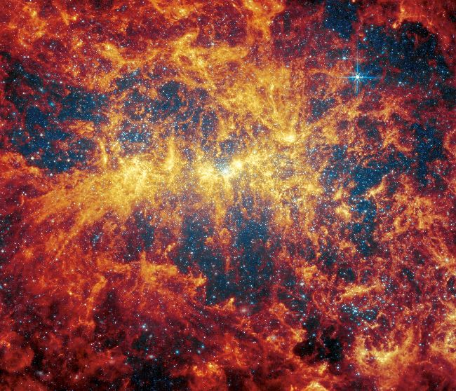 The dwarf galaxy NGC 4449 is the star of the show in the James Webb Space Telescope’s latest cosmic portrait. Located 12.5 million light years away in the constellation of Canes Venatici, the Hunting Dogs, NGC 4449 has much in common with our very own Large Magellanic Cloud (LMC), the satellite galaxy orbiting the Milky Way. Both are small and irregular in shape, and each has a distinctive bar running through its centre. However, whereas the LMC has one extreme region of star formation, which is the 30 Doradus region famously known as the Tarantula Nebula, NGC 4449 has enhanced star-forming rates across its length and breadth. Indeed, there’s so much star formation going on that NGC 4449 is described as undergoing starburst.