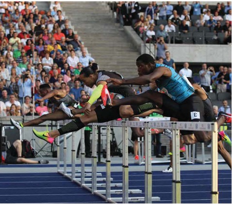 David Omoregie (far side): on his way to Berlin hurdles victory