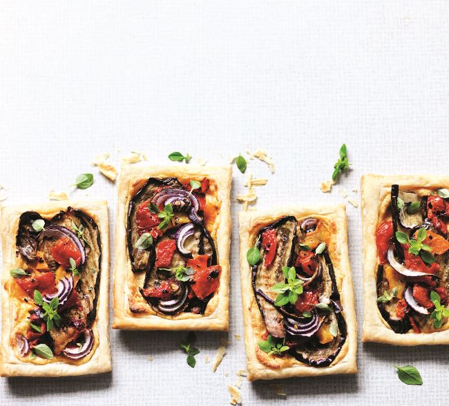 2 Spread a heaped tbsp of houmous over each pastry rectangle, keeping it within the border. Arrange the aubergine slices on top.