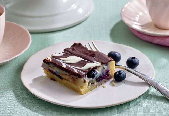 Spoon over the melted chocolate, ensuring the top is completely covered, then leave to set before cutting into squares. Serve with extra blueberries.