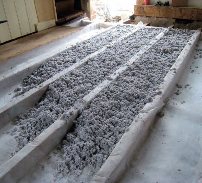 Loose fill cellulose can be poured onto a breathable membrane, in the gaps between joists, to insulate a suspended timber floor. Below left: This loft space has been treated at joist level using hemp batts – a hygroscopic, natural material. Note the eaves are clear of insulation in order to maintain good ventilation
