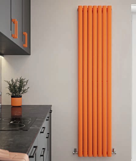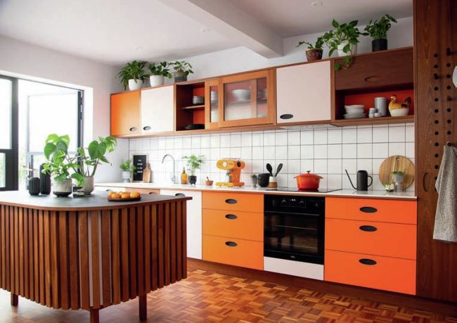 Combine bright orange and earthy green with wood tones for a mid-century modern aesthetic