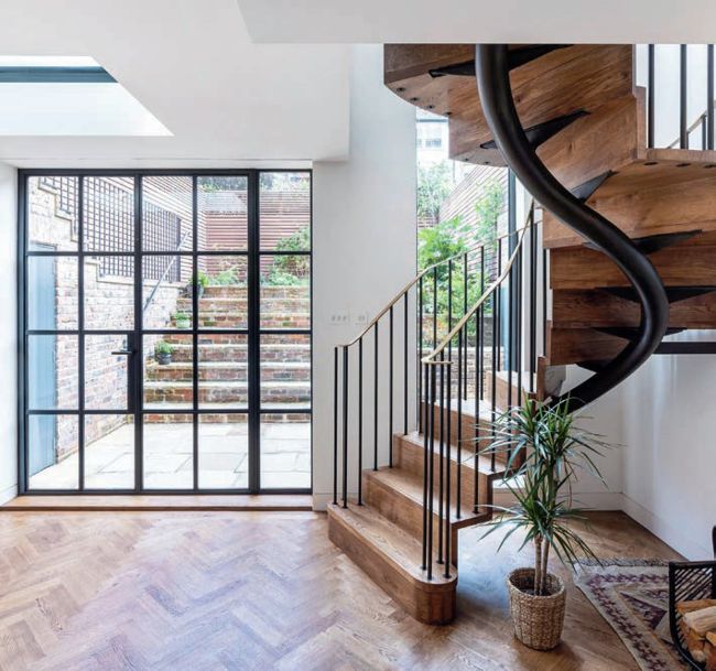 co.uk) worked with Chris Dyson Architects to design this semispiral staircase made up of a hollow circular spine in rolled steel, solid oak treads and a brass handrail