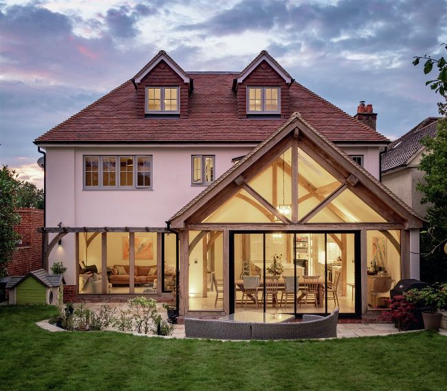 This extension by Welsh Oak Frame (www. welshoakframe. com) blends seamlessly with the design of the original property. The house was renovated as part of the same project, resulting in a unified aesthetic
