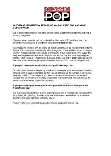 Launched in 2012, the monthly Classic Pop is the world’s leading pop magazine, with an award-winning team of specialist writers bringing you the biggest names in music - it’s the go-to source for pop enthusiasts worldwide.