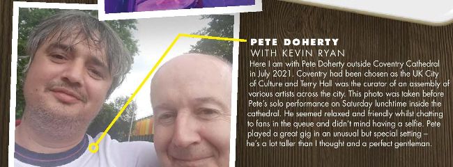 Here I am with Pete Doherty outside Coventry Cathedral in July 2021. Coventry had been chosen as the UK City of Culture and Terry Hall was the curator of an assembly of various artists across the city. This photo was taken before Pete’s solo performance on Saturday lunchtime inside the cathedral. He seemed relaxed and friendly whilst chatting to fans in the queue and didn’t mind having a selfi e. Pete played a great gig in an unusual but special setting – he’s a lot taller than I thought and a perfect gentleman._