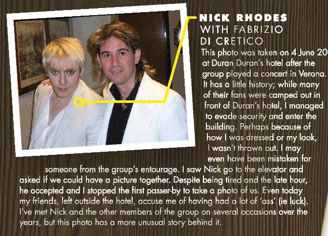 This photo was taken on 4 June 2005 at Duran Duran’s hotel after the group played a concert in Verona. It has a little history; while many of their fans were camped out in front of Duran’s hotel, I managed to evade security and enter the building. Perhaps because of how I was dressed or my look, I wasn’t thrown out. I may even have been mistaken for someone from the group’s entourage. I saw Nick go to the elevator and asked if we could have a picture together. Despite being tired and the late hour, he accepted and I stopped the fi rst passer-by to take a photo of us. Even today my friends, left outside the hotel, accuse me of having had a lot of ‘ass’ (ie luck). I’ve met Nick and the other members of the group on several occasions over the years, but this photo has a more unusual story behind it.