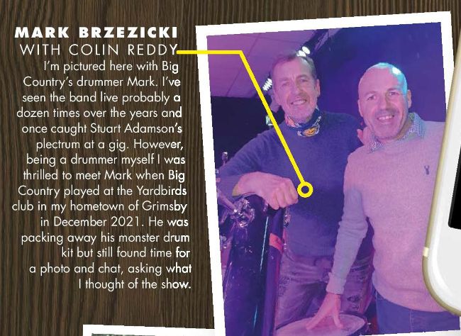 I’m pictured here with Big Country’s drummer Mark. I’ve seen the band live probably a dozen times over the years and once caught Stuart Adamson’s plectrum at a gig. However, being a drummer myself I was thrilled to meet Mark when Big Country played at the Yardbirds club in my hometown of Grimsby in December 2021. He was packing away his monster drum kit but still found time for a photo and chat, asking what I thought of the show.