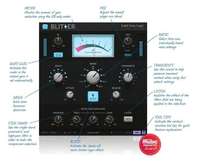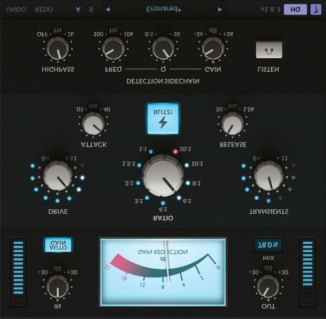 Many SSL hardware compressors are already available in fantastic plugin emulations. But the company has also developed further compressor plugins from the ground up like X-Comp and X-valvecomp. That continues with its latest addition, Blitzer. A ‘compressor with attitude’, it looks conceptually similar to Empirical Labs Distressor. It aims to deliver everything from soft, saturating compression right up to brick wall limiting, and combines regular compression controls with dedicated Drive and Transient-shaping processors. Nevertheless, one-knob-style controls coupled with a clear layout and dedicated gain reduction meter keep things easy to understand. Throw in a few convenient extras like output wet/dry mix, output Auto Gain, oversampling mode (HQ), undo/redo, context-sensitive tool tips, and a very well spec’d sidechain EQ section (see box out) and you get a great combination of sonic flavours all in one easy to use plugin.