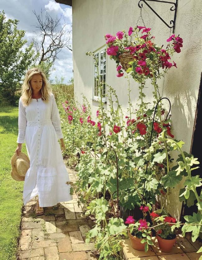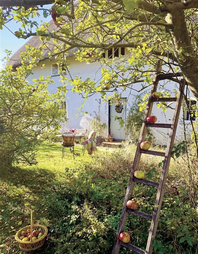 |OPPOSITE| APPLE PICKING. Tending to her garden is one of Rebecca’s favorite hobbies. “Once you grow into a garden, you have to tend to it more,” she points out. “We have apple, pear, walnut and damson trees, so we have lots of fruit.”
