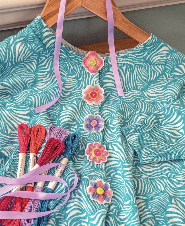 STITCH the flower, then use sharp scissors to cut around the flower shape, leaving one blank square of plastic aida all around the stitching.
