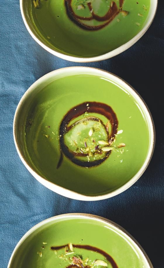 “Pistachios give this soup a soothing homespun texture, thick and faintly mealy. Their scent after a quick spell in hot butter works a treat with the watercress, while the pomegranate challenges its slight bitterness. It’s a soup that suggests that all is well with the world. You might like to crumble a little goat’s cheese over the soup for added pleasure.”