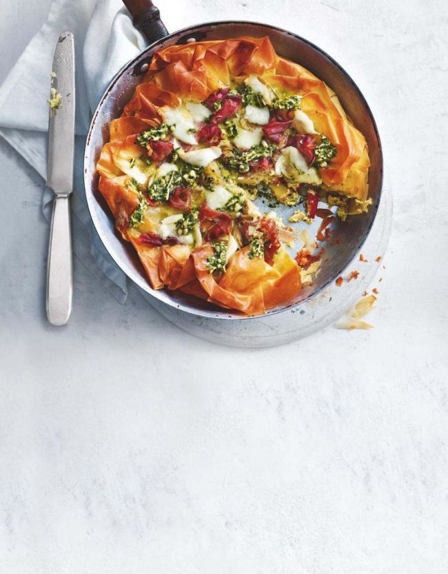 A few spare spoonfuls of basil pesto will pep up any weeknight meal, including this smart tart