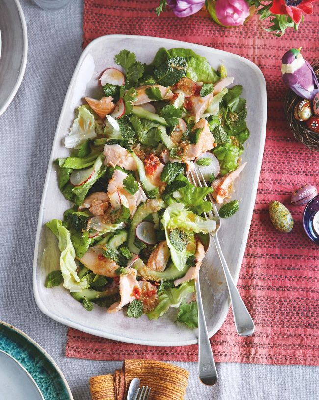 Make the salad (without dressing it) up to 12 hours ahead and keep in the fridge, covered with damp kitchen paper. Once cooled, the salmon can be stored in a container in the fridge for up to 48 hours. The dressing can be made up to 1 week in advance. Keep in a sealed container in the fridge.
