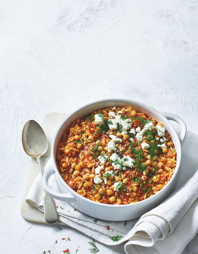 Chickpea, orzo and tomato stew with feta and fresh dill