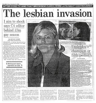 The difference was that mine – a vaguely lesbian erotic short film featuring two lesbian actors and a red Alfa Romeo Spider – was relegated to the margins of the schedule, while the Brookside scene, featuring two straight actors and a doorframe, was transmitted in prime time.