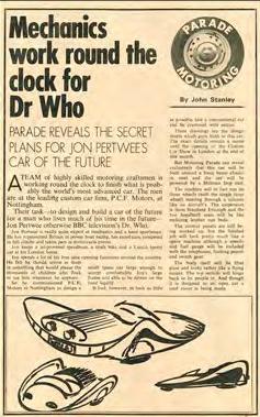 Stories about Jon Pertwee’s “space-age car” appeared in Parade (2 October, top left), the Daily Mirror (24 September, above left) and Weekender (13 December, above right).