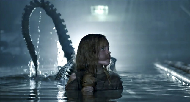 Putting his disowned debut Piranha II: The Spawning aside, Cameron’s first brush with the wet stuff comes in this classic scare moment: as Newt (Carrie Henn), chest-high in water, waits to be rescued, a pesky xenomorph slowly rises behind her and takes her down. Cut to a chilling glimpse of a submerged doll’s face. Don’t worry — Newt survives.