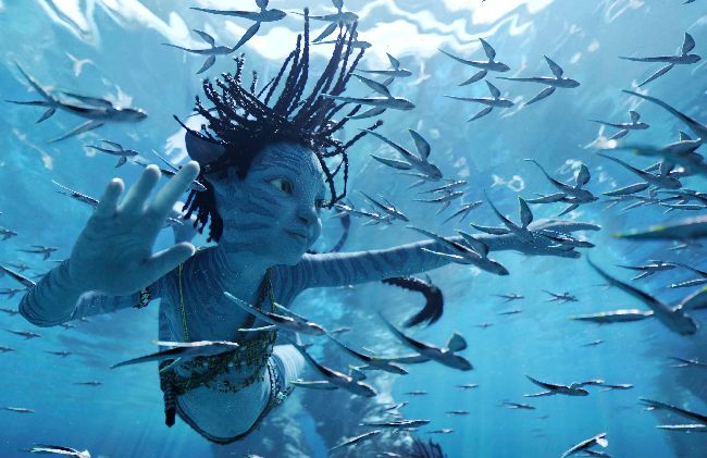 The official subtitle has all the feel of an arts-y mood title, but Cameron confirms it’s An Actual Thing in the film. It stems from his unfinished novelisation of the first film (“I never have the damn time to write”) where Zoe Saldaña’s Neytiri has an ethos she calls ‘the way of air’. By understanding how air, wind and turbulence interact, by understanding what air does to a creature’s wing membranes, she believes, you can then fly more effectively. For the new film, he simply transposed the concept to water. “It’s a repeated motif,” he says. “‘The way of water’ is understanding the medium in which you operate.”