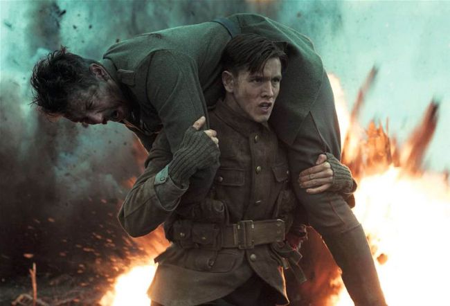 War hero? Conrad (Harris Dickinson) helps a fellow soldier.