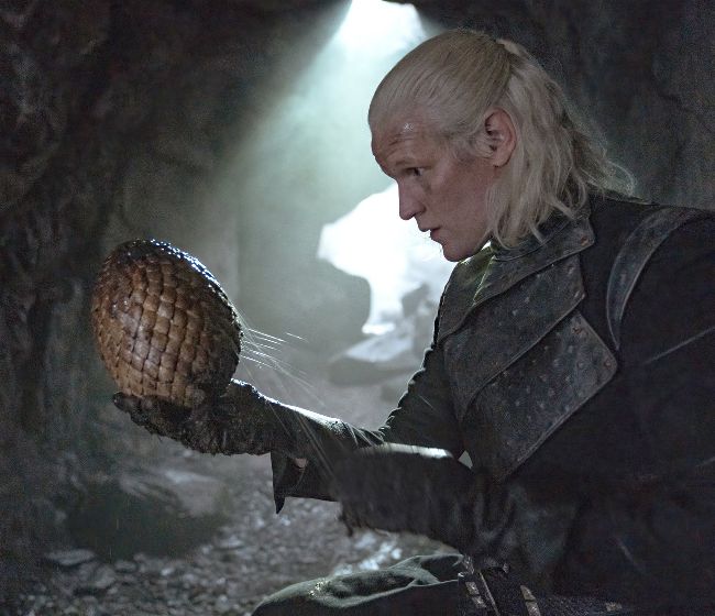 Daemon (Matt Smith) inspects a dragon’s egg;