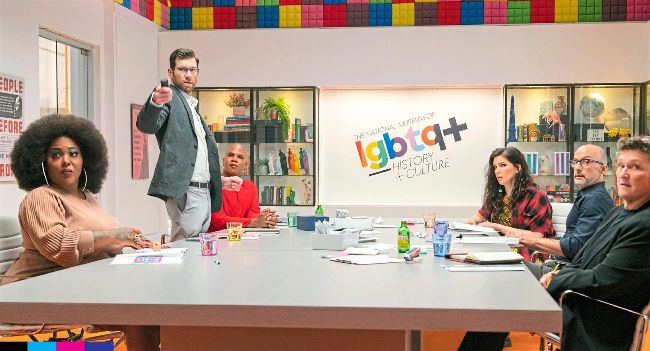 Bobby (Billy Eichner, second left) takes the floor before Angela (Ts Madison), Wanda (Miss Lawrence), Tamara (Eve Lindley), Robert (Jim Rash) and Cherry (Dot-Marie Jones).