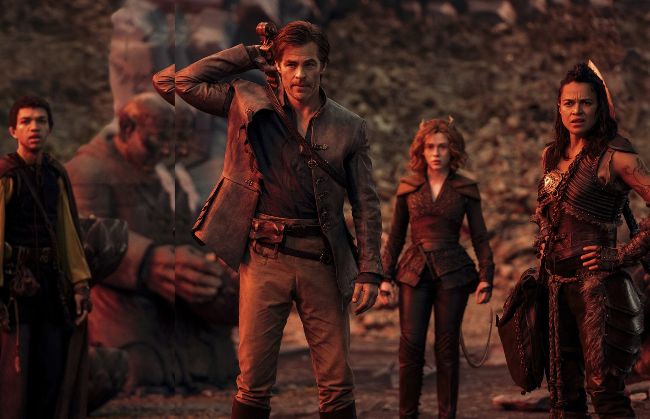 Dungeons & Dragons: Honour Among Thieves’ Simon (Justice Smith), Edgin (Chris Pine), Doric (Sophia Lillis) and Holga (Michelle Rodriguez). Left: Hugh Grant, John Francis Daley and Jonathan Goldstein on set with Rodriguez and Pine.