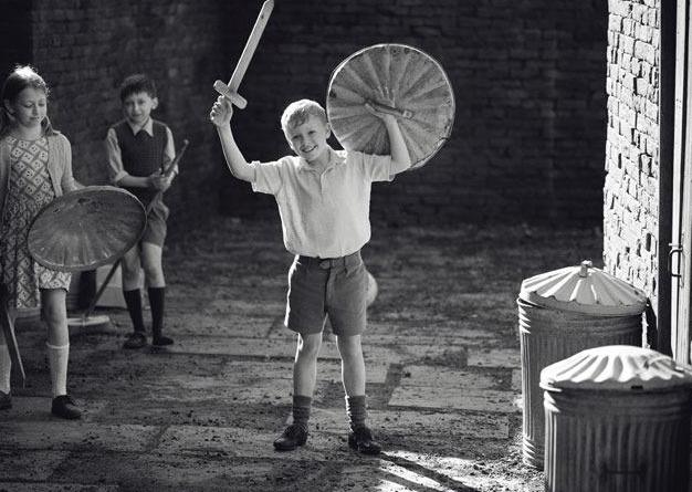 Jude Hill as Buddy, brandishing his makeshift sword and shield as his pals look on.