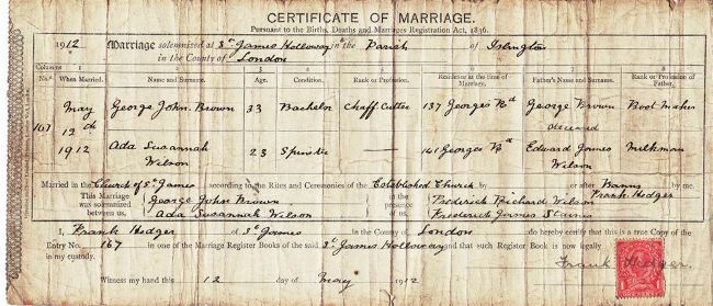 QI have been trying to find my grandfather’s parents for some years, and over time an accumulation of names have come forward, but I am not sure that any of them are right. I have my grandfather’s wedding certificate that says that George John Brown got married in 1912 to Ada Susannah Wilson, and the only clue to his father is George Brown, Bootmaker. If you can help in any way I would be extremely grateful. Even clues as to how to progress would help a lot.