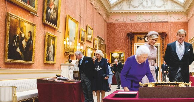 The Queen with King Willem-Alexander and Queen Máxima of the Netherlands, and the Prince of Wales and Duchess of Cornwall, in the Picture Gallery in 2018 – the Queen also hosted US President Donald Trump here in 2019