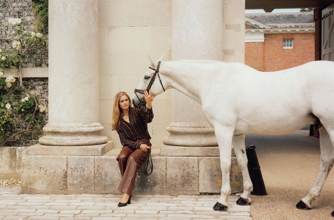 Lois, teaming up with grey gelding Abbey for our photoshoot, wears blouse by Heyanno, trousers by Haikure and shoes by Essen
