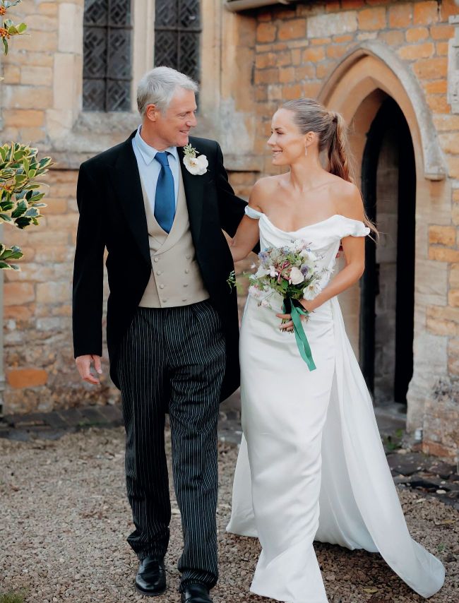 Hum, wearing Vivienne Westwood, emerges from the church with Zac
