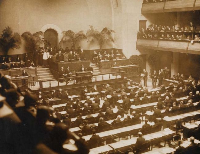 The official opening of the League of Nations in 1920. The decision of the United States not to join the League was a source of tension between Britain and America