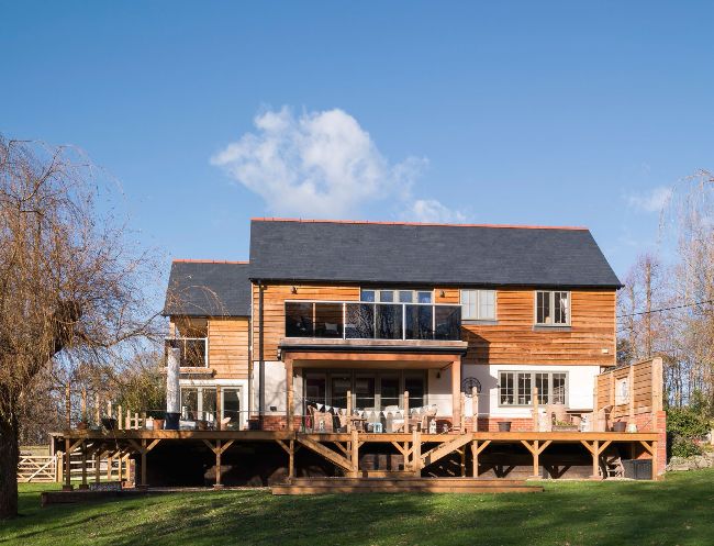 BUILDING ON A SLOPING SITE This timber frame self-build (the frame was provided by Potton) was constructed on a sloping plot. The homeowners, Lesley and David Lennox, built an expansive deck (approximately 70m2) to provide a patio with a level threshold from the main living spaces.