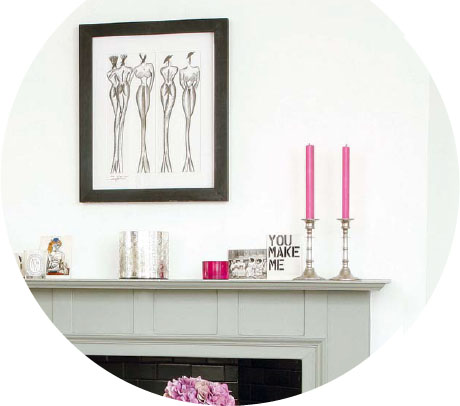 Jo uses pretty candlesticks to add pops of bright colour to her mantelpiece