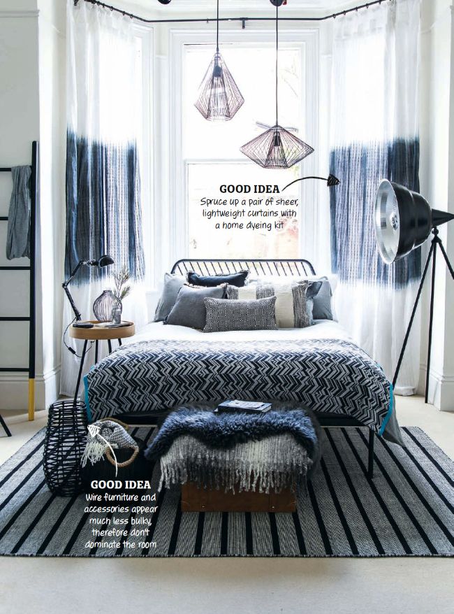 This stripped-back, timeless look will give your bedroom a dreamy feel that’s calming and tranquil. Keep the colour scheme neutral, then layer up with warm greys, dramatic black and chalky white accessories for an edgy, urban feel. Lightweight window dressings will keep the room feeling bright and airy. For an inexpensive but effective option, dip-dye some white sheer panels in diluted hand dye to get a designer look for less. Choose stand-out pieces of black furniture with wooden detail to add extra warmth to the room, and dress with wire accessories for an instant industrial edge. Create an eye-catching lighting feature by hanging wire pendants, and team with bold, graphic artwork in plain black frames to complete the look.