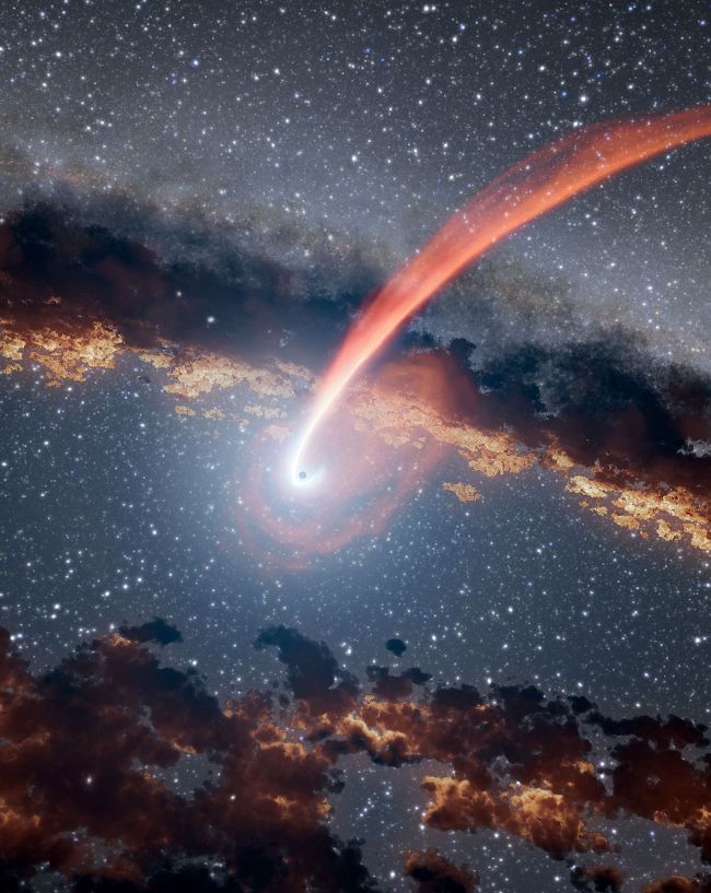 n The supermassive black hole at the centre of our Milky Way galaxy is called Sagittarius A* and weighs approximately 4 million solar masses, or 4 million times the weight of our Sun. This massive monster gobbles up everything that comes close - including light - and grows in size the more material it takes in. The heavier this gargantuan gobbler becomes, the stronger its gravitational influence, allowing it to suck in even more sustenance. However, even with a massive gravitational reach, there’s not much chance a black hole could eat an entire galaxy. It’s also theorised that there’s a limit to how big they can grow - about 50 billion solar masses.