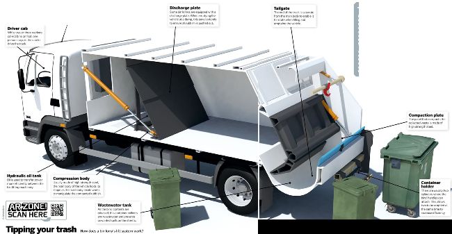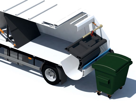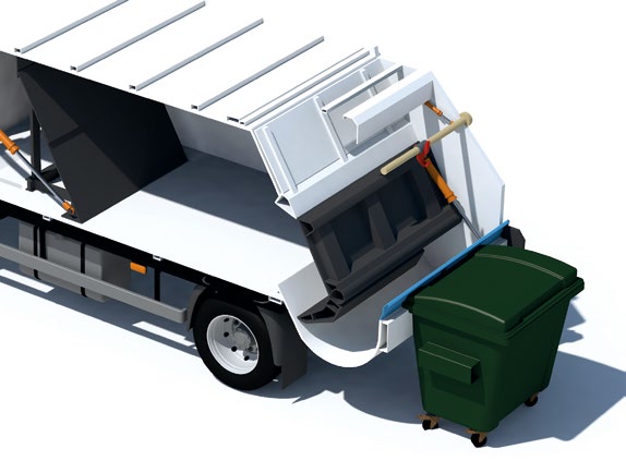 As the bin is lowered to the ground to be returned to the street, a compaction plate comes down to block the back of the truck. This contains all rubbish – and the stench!