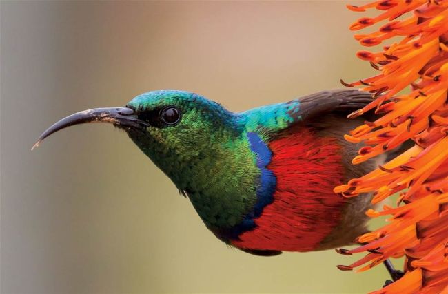 A double-collared sunbird is a tiny, colourful bird that resembles a hummingbird