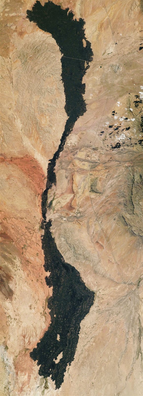 An astronaut aboard the International Space Station (ISS) has snapped a stunning photo of an ancient lava flow stretching across the desert in New Mexico. From above, the frozen river of volcanic rock looks like a dark scar carved into the surrounding desert. The basaltic lava flow, known as the Carrizozo Malpaís, covers around 130 square miles and is around 50 miles long. It’s located near Carrizozo, a city in the Chihuahuan Desert in New Mexico, and is one of the largest lava flows to have formed on Earth in the past 10,000 years. The eruption that birthed the Carrizozo Malpaís began around 5,000 years ago and lasted for between 20 and 30 years. During that time, magma slowly trickled out of the ground from a subsurface shield volcano, which has since become dormant. Insulated lava tubes beneath the surface spread the molten rock out over an unusually large area.