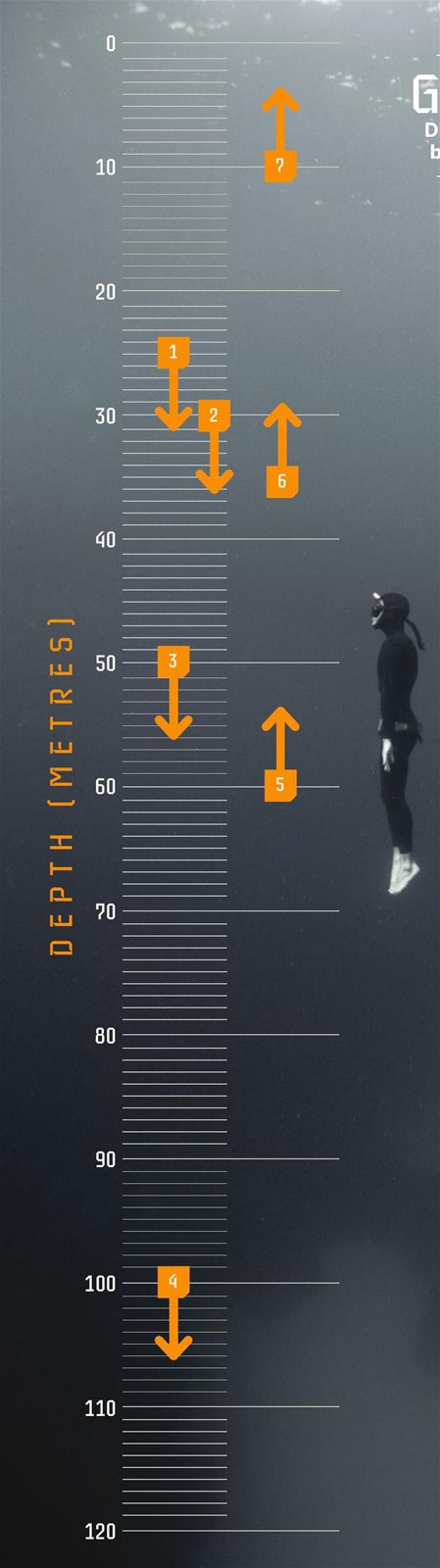 1 BUOYANCY LOSS At around 25 metres below water surface level, divers lose buoyancy and can sink at around one metre per second.