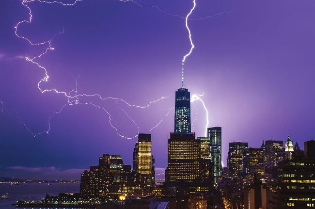 The One World Trade Center (WTC) in New York acts like a 104-floor lighting rod. It’s constructed from conductive materials that turn it into a huge Faraday cage, preventing any electrical current from passing into the interior. Lightning strikes a group of rods at its roof that redirect the electrical energy down the sides of the building and discharge it into the bedrock beneath.