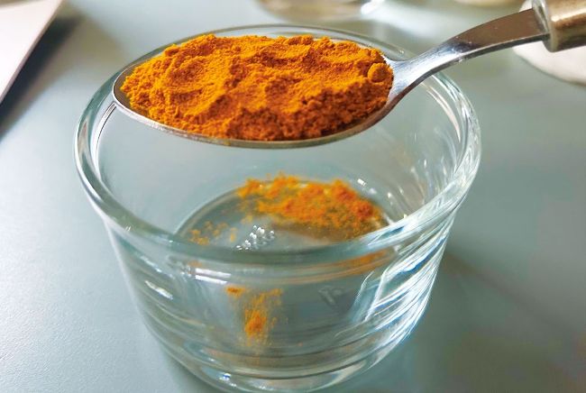 2 MAKE TURMERIC INK Measure out one tablespoon of turmeric into a bowl and add water. This should be just enough water to create an ink with a deep colour.