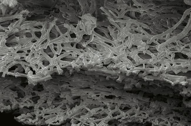 The bone-like lattice structure shown in this photo is of a chicken eggshell under a scanning electron microscope. The curious shapes in the image are calcium carbonate crystals that form the hard eggshell and are deposited from the mother hen’s uterus, also known as the ‘shell gland’. It takes roughly 20 hours for a chicken to form an eggshell.