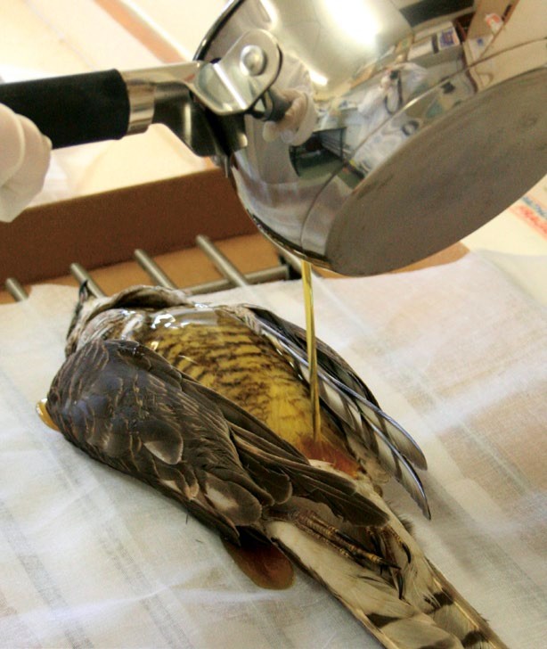 A dead sparrowhawk is covered with resin and beeswax prior to mummification