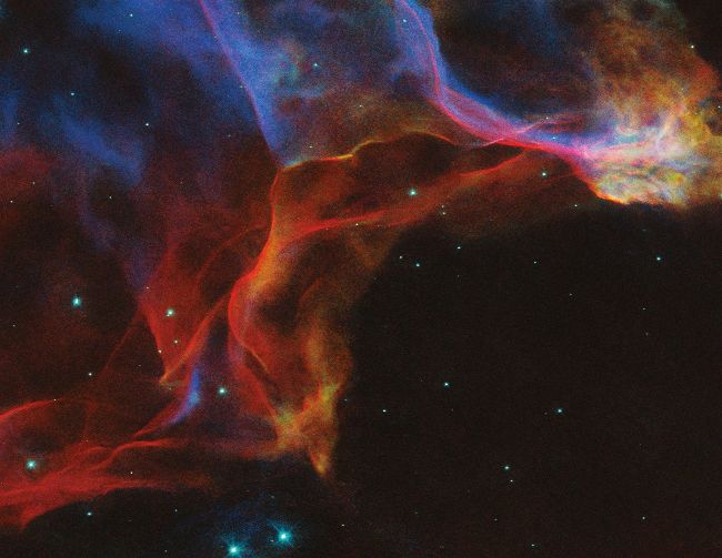 Drifting in the void of space around 2,400 light years away is an ethereal cloud of stardust called the Veil Nebula. Hubble captured this view of the gossamer-like nebula using data from its Wide Field Camera 3 in 2021. This instrument uses different filters to observe emissions of hydrogen, sulphur and oxygen atoms released by the supernova event that created the Veil Nebula around 10,000 years ago.