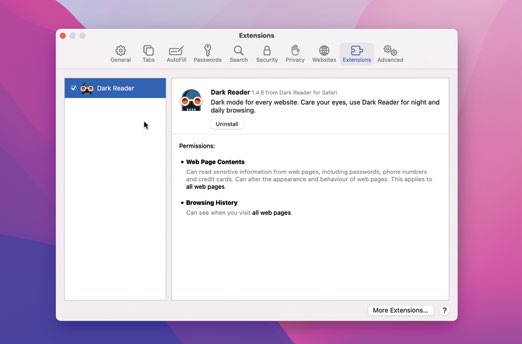 Enable the extension Go to Safari>Preferences> Extensions to turn on Dark Reader