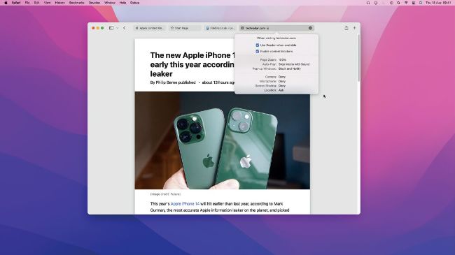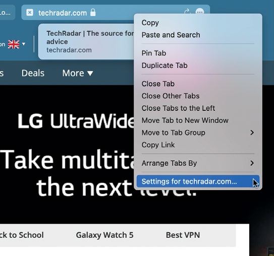 Now, while in Safari, navigate to the site you wish to apply certain settings to and then ctrl+click on the URL to bring up a menu of options. Select ‘Settings for [site name]’.