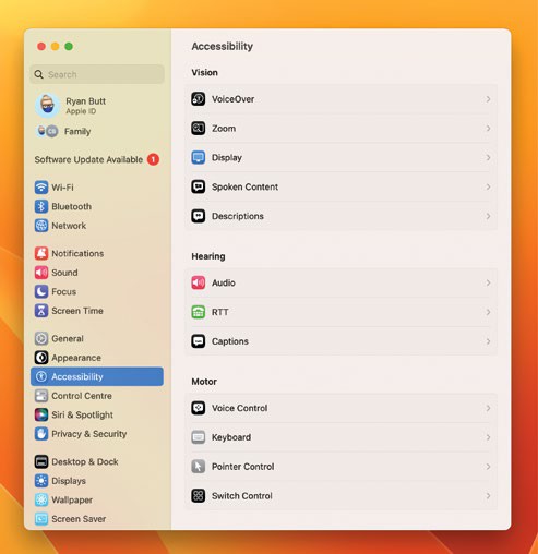 With macOS Ventura installed, go to System Settings>Accessibility, then scroll down to the Hearing section. Here you will find the ‘Audio’ option, click on this.